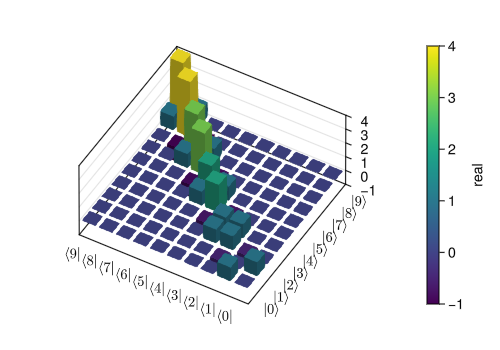 QuantumToolbox.jl offers a few functions for quickly visualizing matrix data in the form of 2D heatmap (matrix_heatmap) and 3D histogram (matrix_histogram).